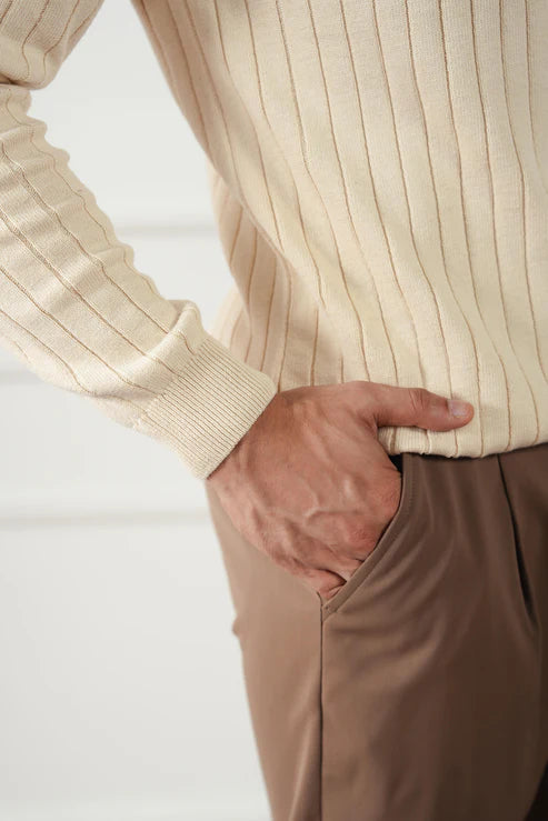 A timeless expression of refined ease, the Rib Knit Polo Sweater is crafted from 100% cotton knitted yarn for exceptional comfort and structure. The vertical rib pattern lends a clean, elongated silhouette, while the open collar design adds a relaxed sophistication — ideal for layering through fall and winter.